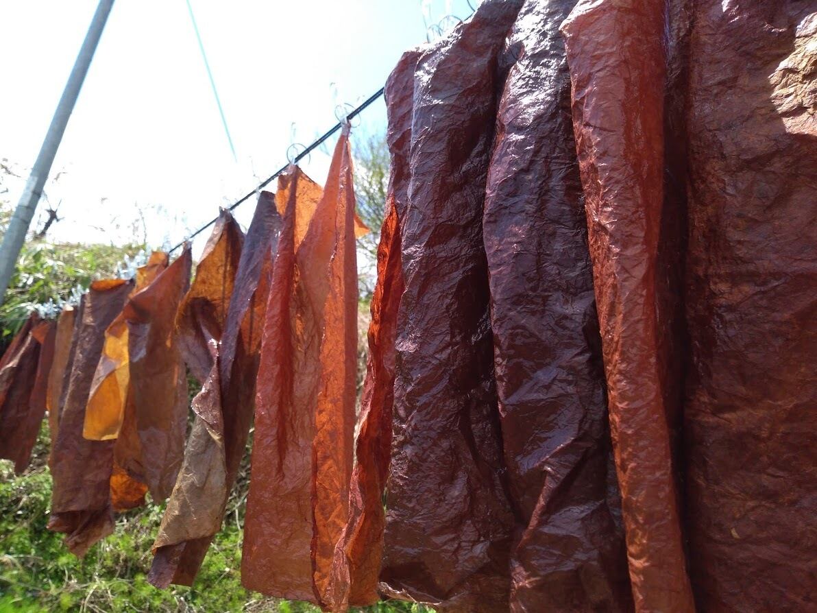 柿渋とこんにゃく糊を塗りこんで揉みこんだ紙